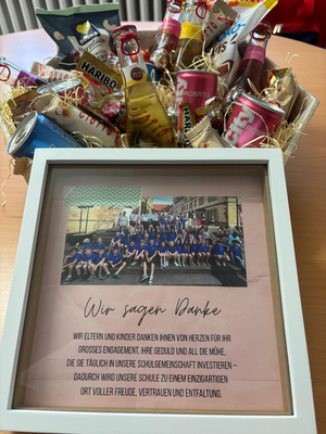 Zudem bekamen wir Lehrerinnen von unseren Schuleltern als großes Dankeschön für unterschiedliche Engangements einen Überraschungskorb mit viel Nervennahrung und Vielem mehr überreicht.